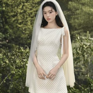 Đầm cổ ngang chân A buộc nơ 2 bên vai