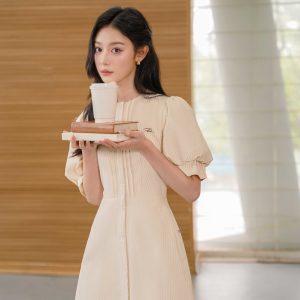 Đầm cổ U nhỏ phối sơ mi, chân xếp ly