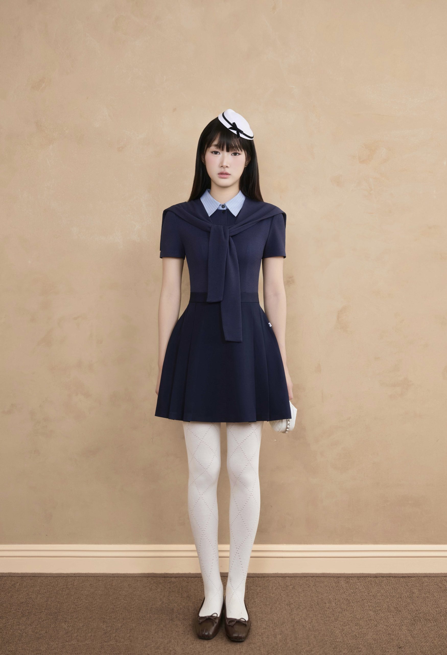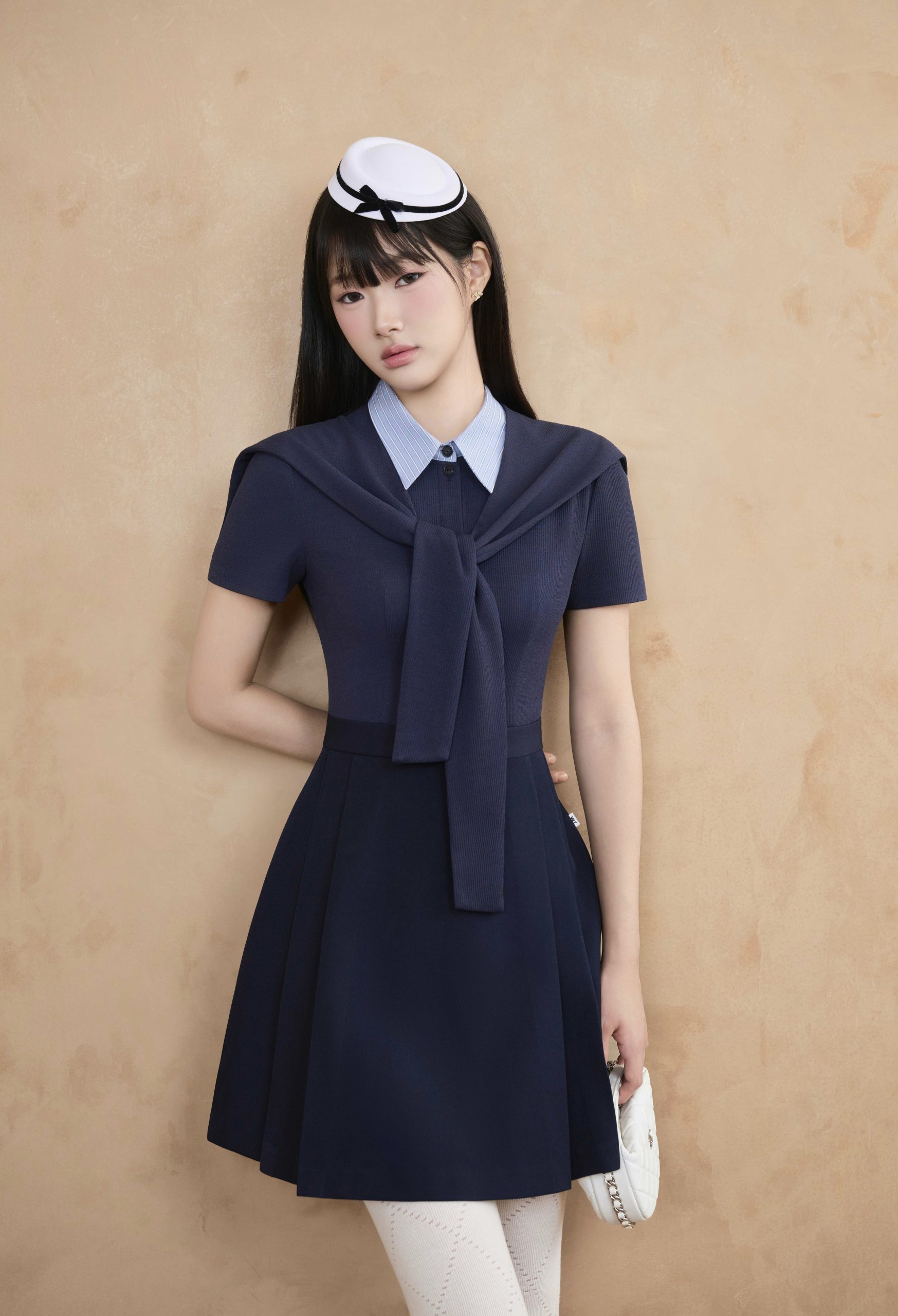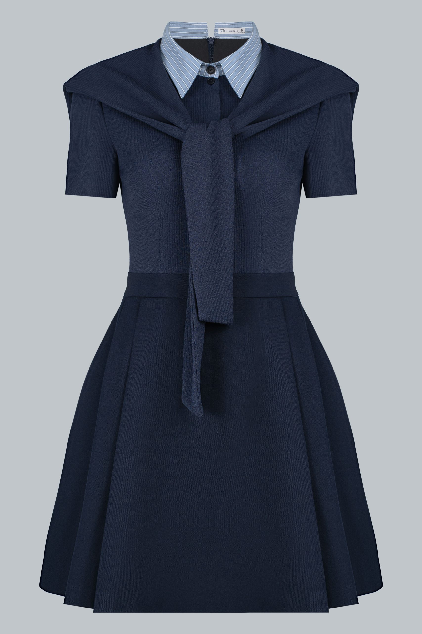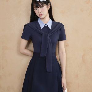 Đầm dáng A-line ngắn trên gối, tôn dáng gọn gàng và năng động. Cổ sơ mi kẻ sọc xanh nhạt may liền giả layer tạo hiệu ứng layering gọn gàng, tăng chiều sâu cho trang phục. Khăn quàng ngang vai cùng chất liệu mang đến điểm nhấn preppy chic đặc trưng, vừa casual vừa tinh tế. Gam navy cổ điển kết hợp điểm nhấn xanh nhạt giúp sáng bừng gương mặt và tạo nên khí chất sang trọng.
