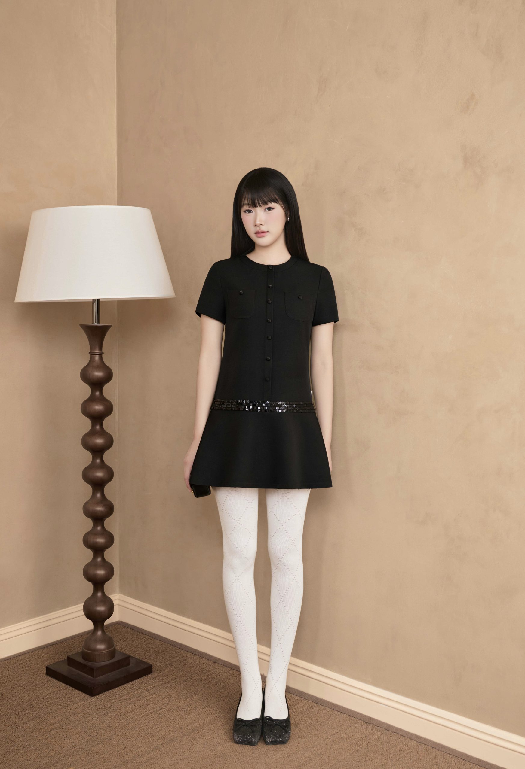 Đầm mini trên gối, dáng suông nhẹ ôm, khéo léo che dáng và tạo sự cân đối. Thân trên cổ tròn đơn giản, nhấn nhá hàng khuy và hai túi trước ngực, mang lại sự chỉn chu, gọn gàng. Điểm nhấn sequin lấp lánh ở ngang eo tạo hiệu ứng thị giác bắt sáng, khiến tổng thể không bị đơn điệu. Phom dáng ngắn trẻ trung giúp outfit vừa thanh lịch vừa có chút tinh nghịch.